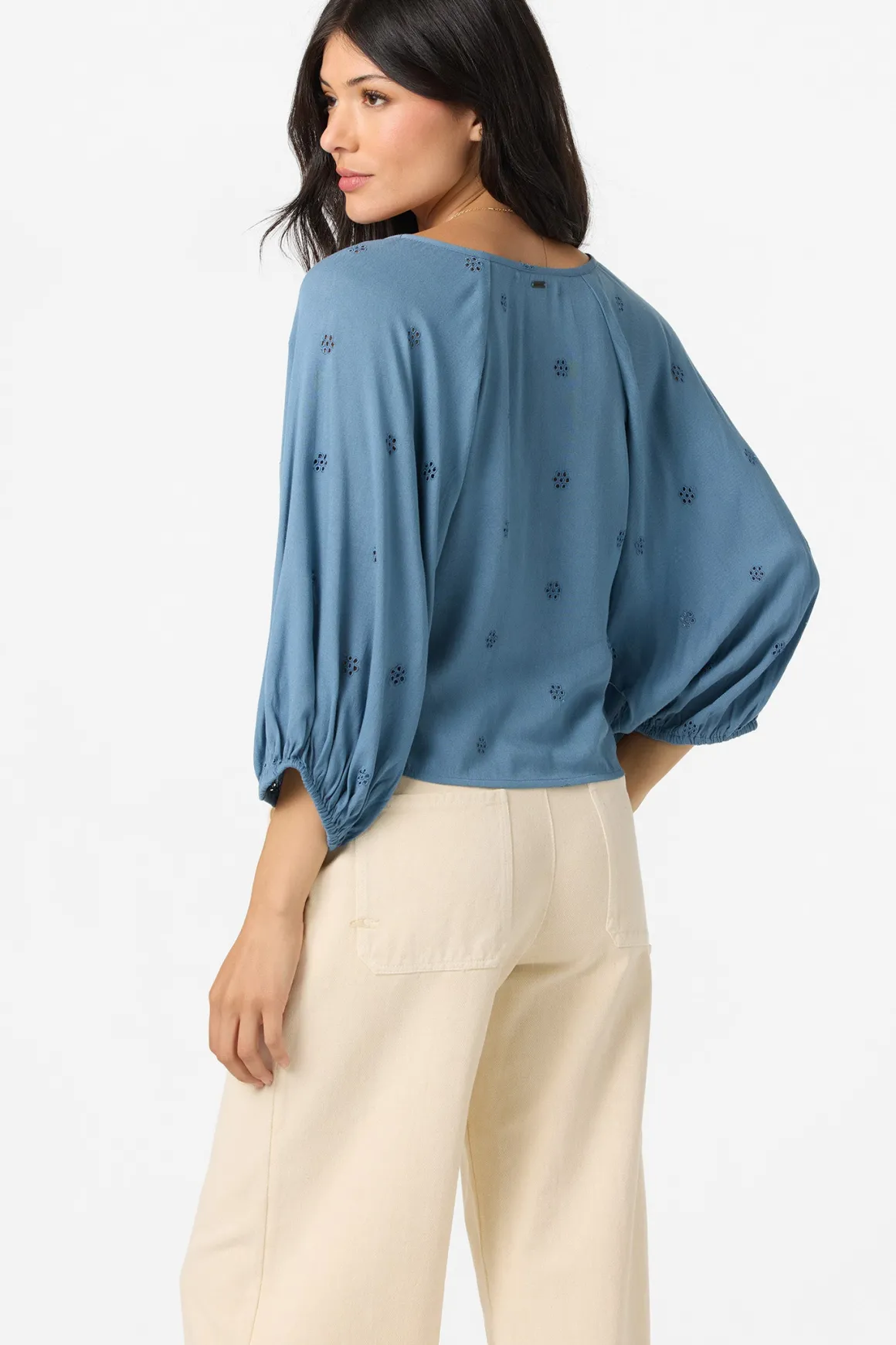 Light and breezy with a touch of charm, this woven V-neck top features puff sleeves, delicate button-loop details, and a dreamy floral print.