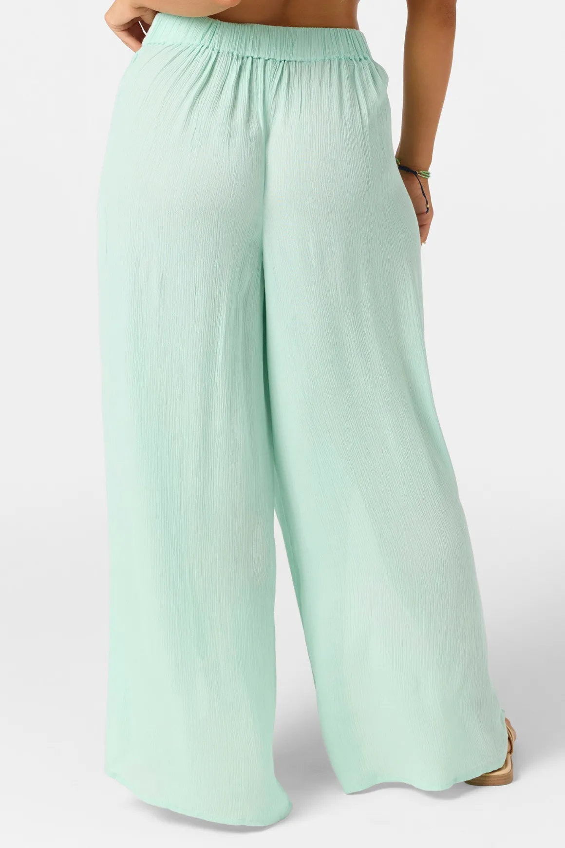 Laid-back, flowy woven pant that radiates effortless style. It features an elastic waist, wider fit and split leg detail.