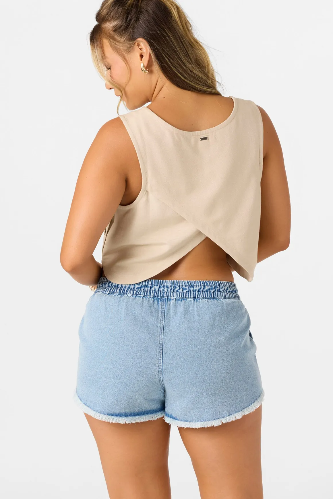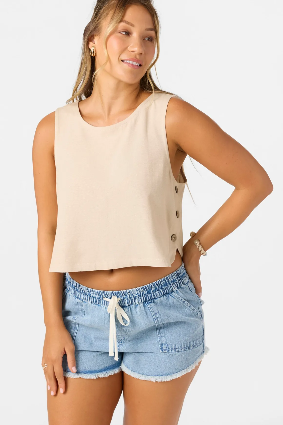 Ready for sunshine woven tank top that features a skimmer length fit, functional side seam buttons and cross over back detail.