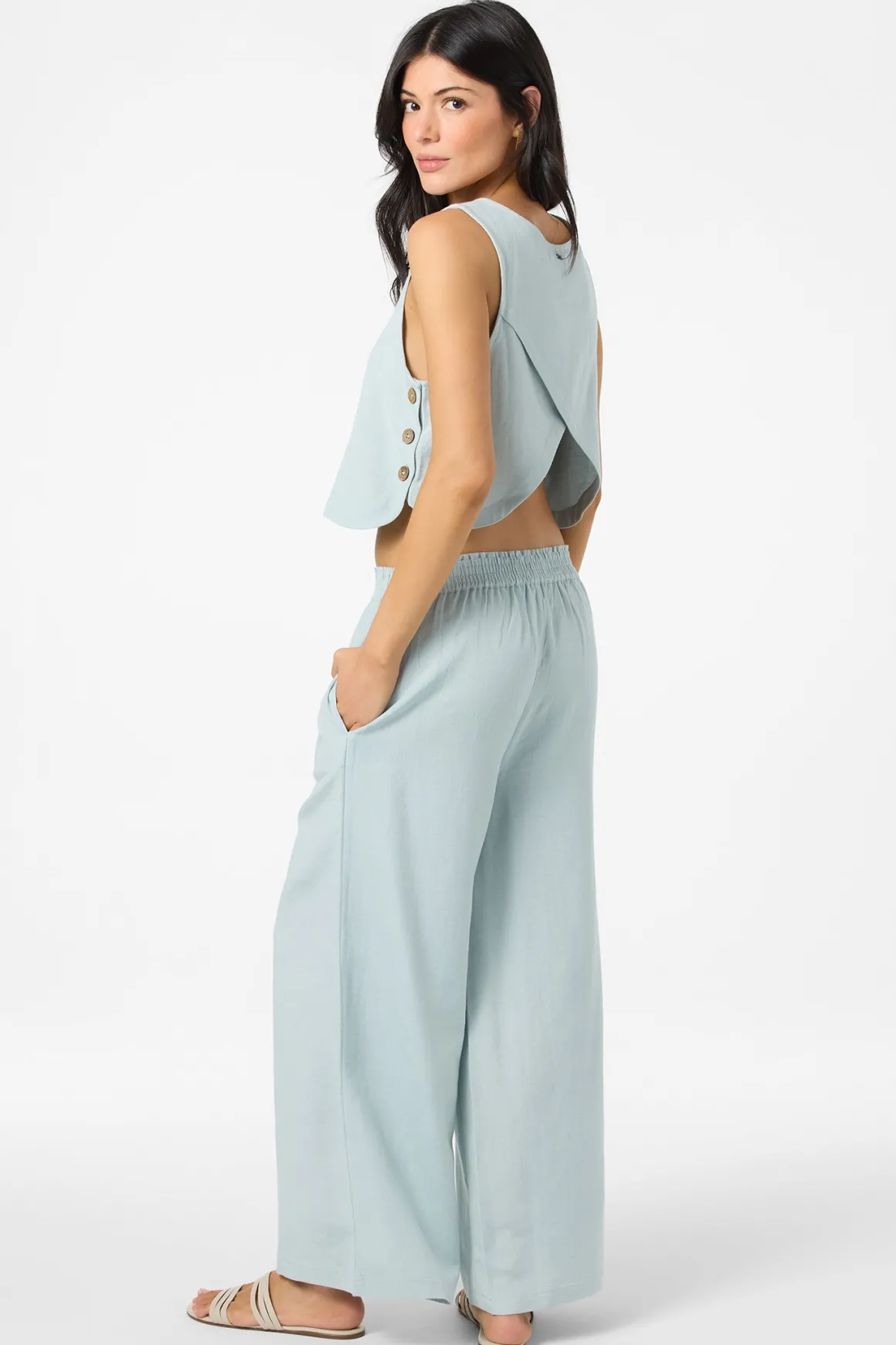 Essential woven pant that has a relaxed, flowy leg fit, solid color wash and flood length fit.