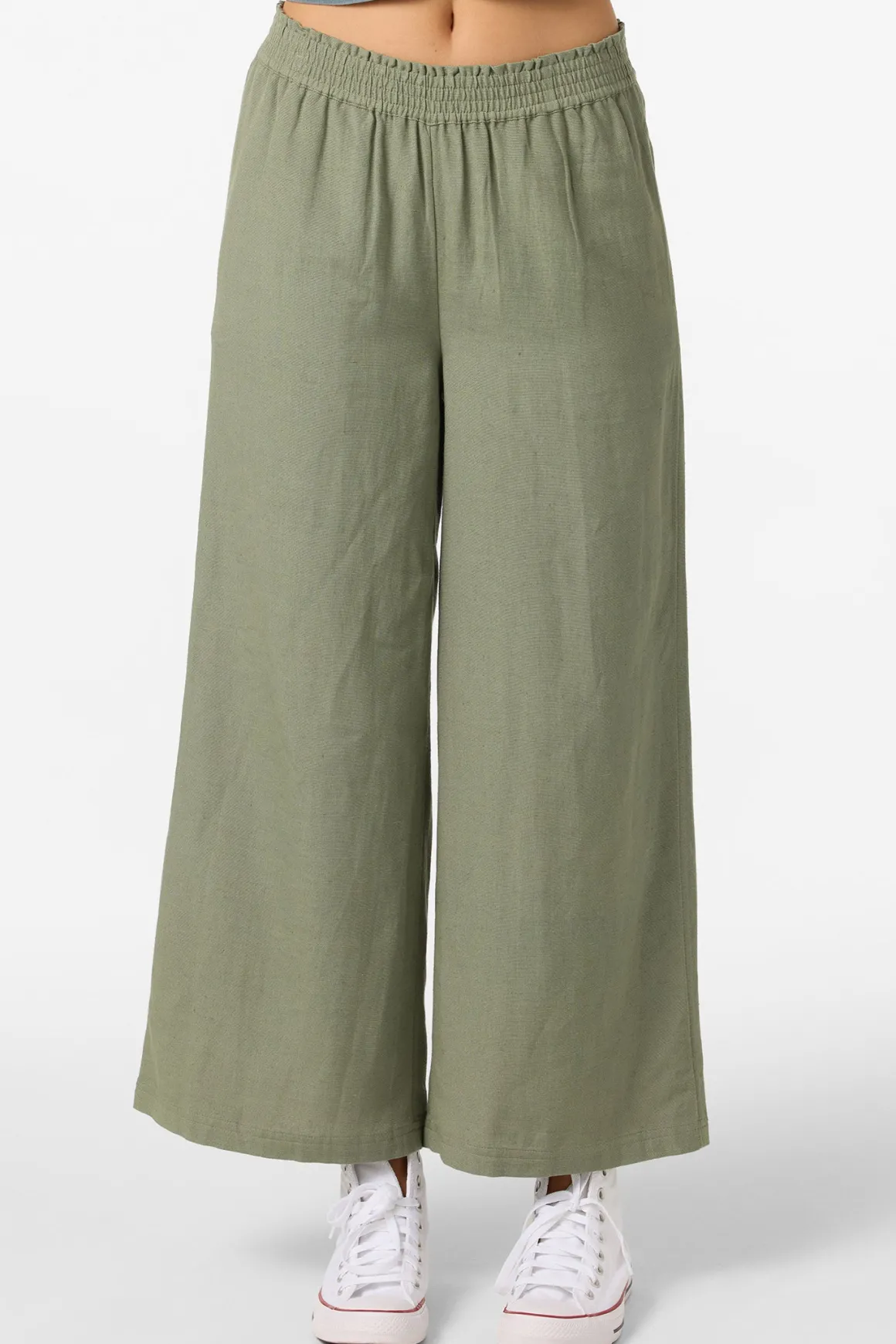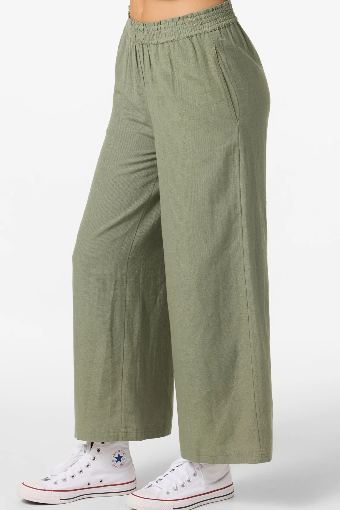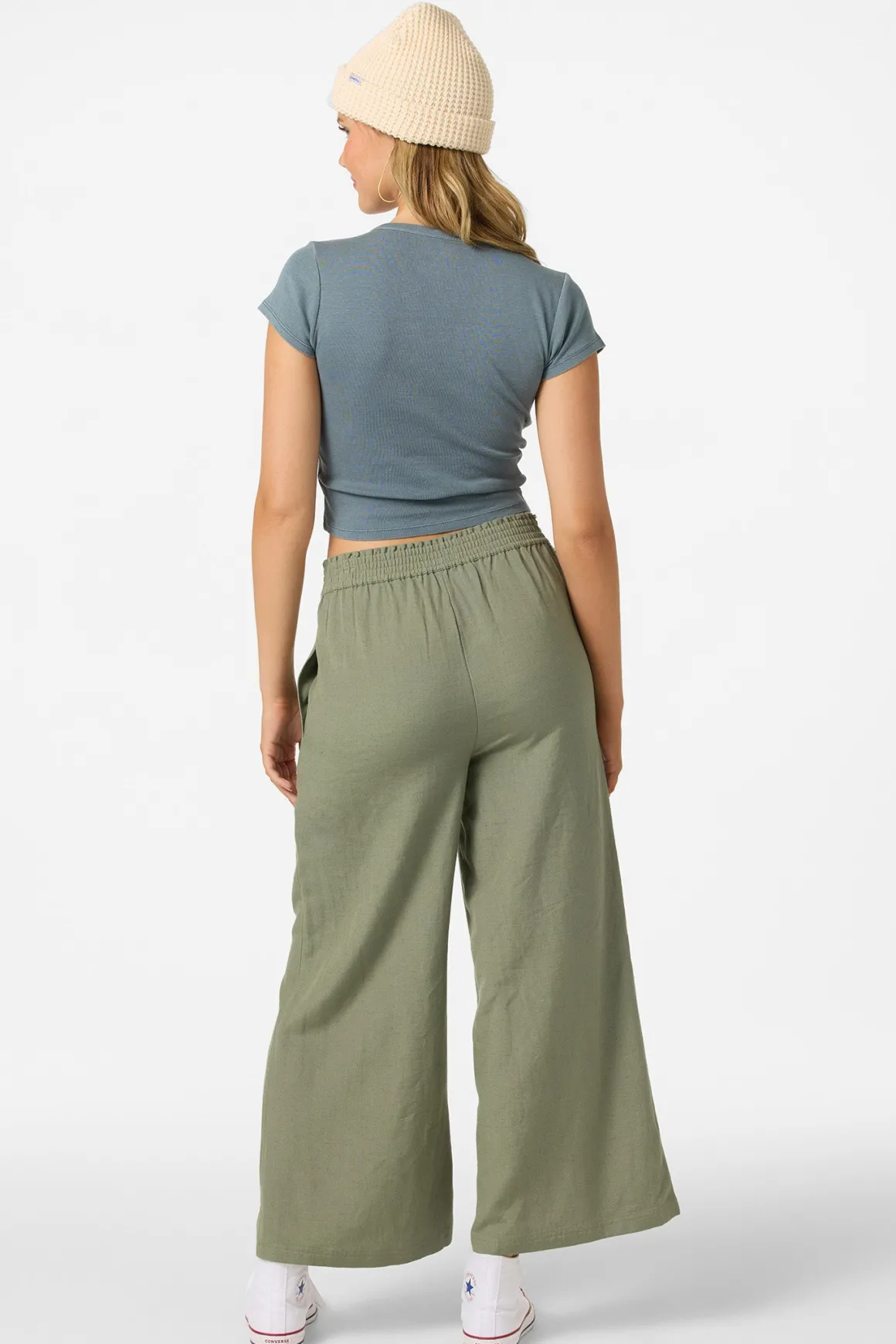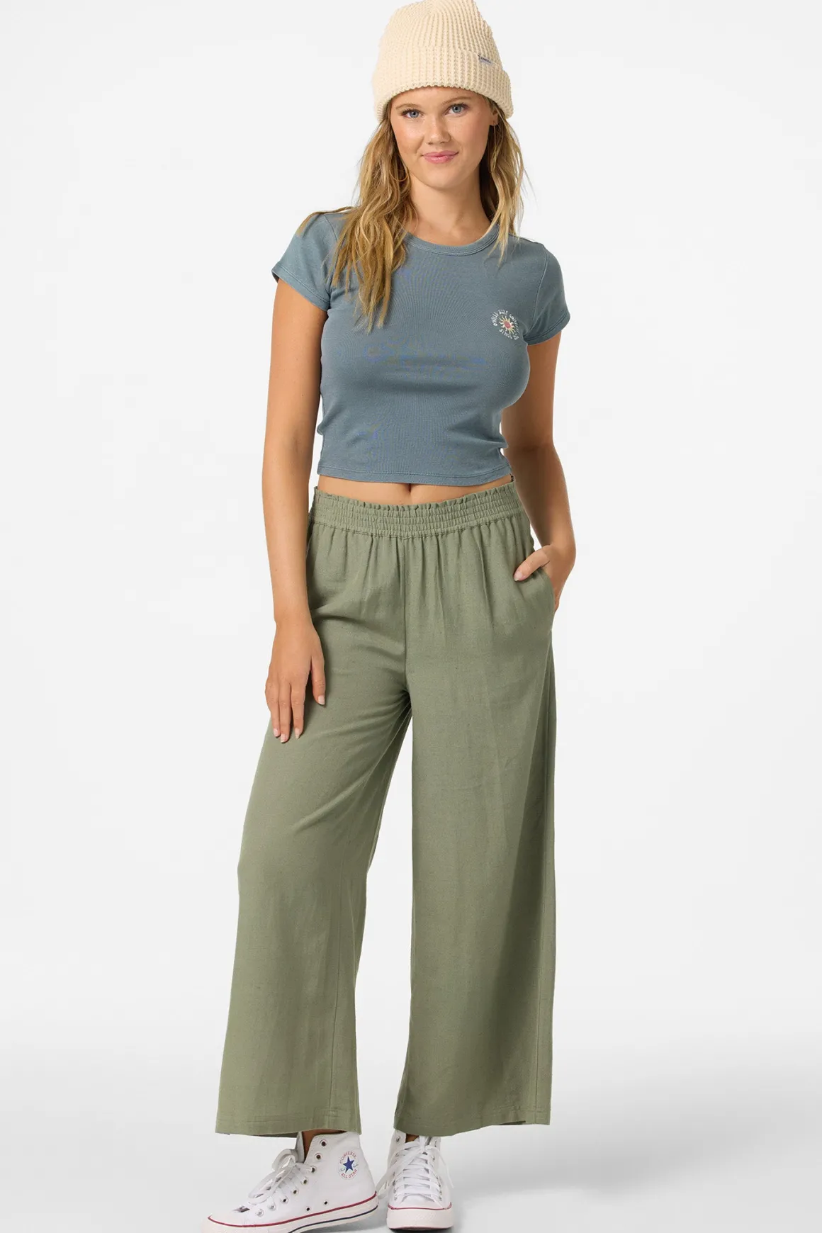 Essential woven pant that has a relaxed, flowy leg fit, solid color wash and flood length fit.