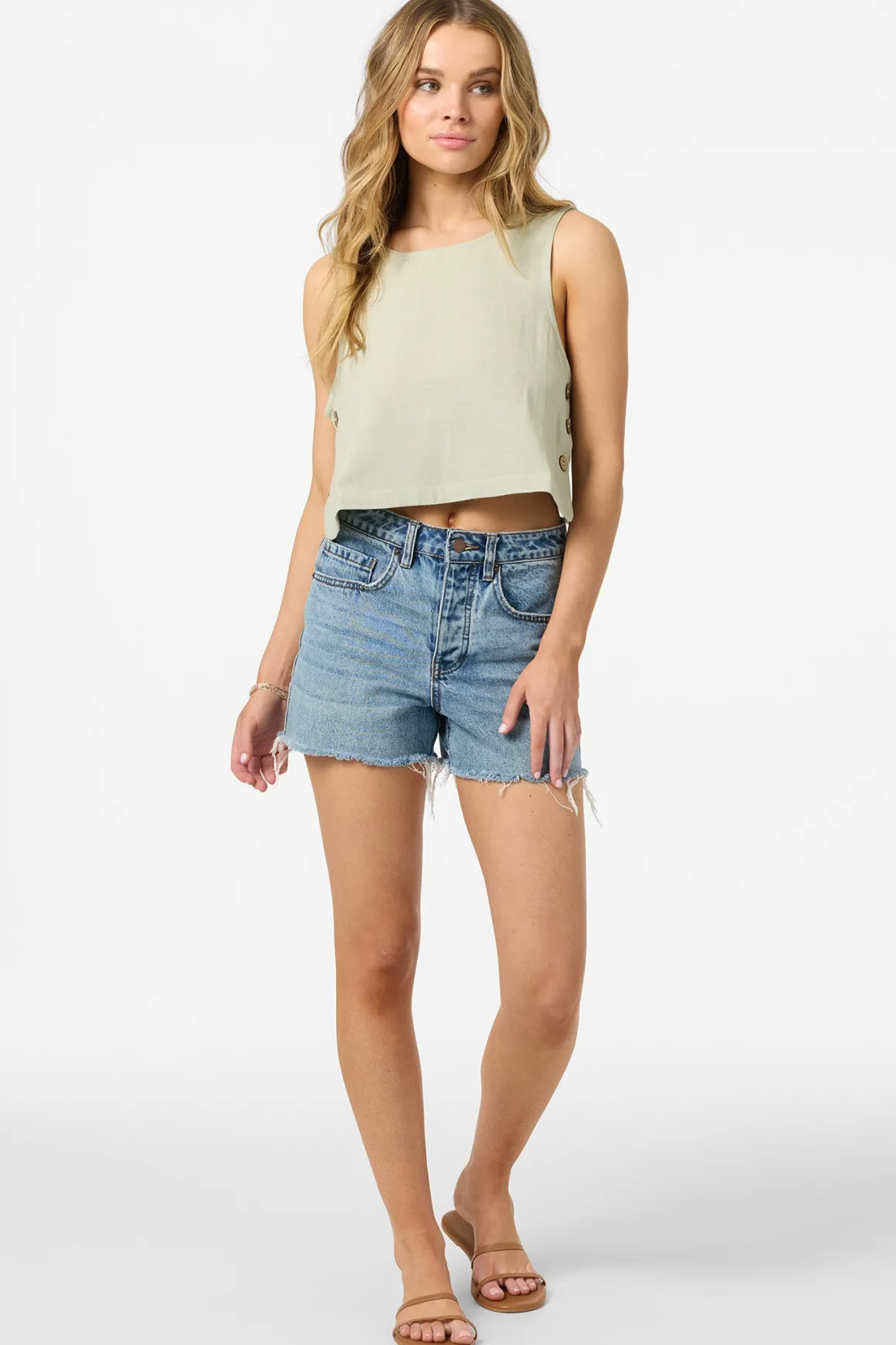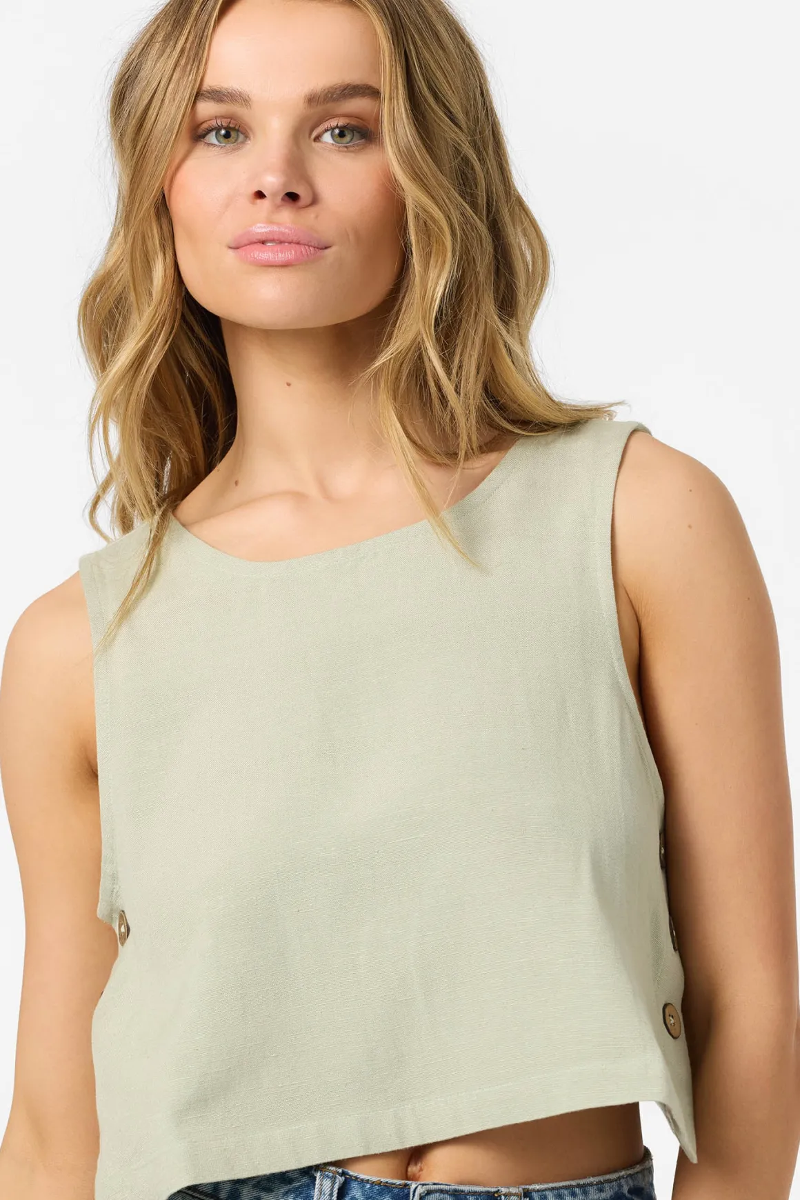 This cute woven tank top features a skimmer length fit, functional side seam buttons, and wrapover back detail.