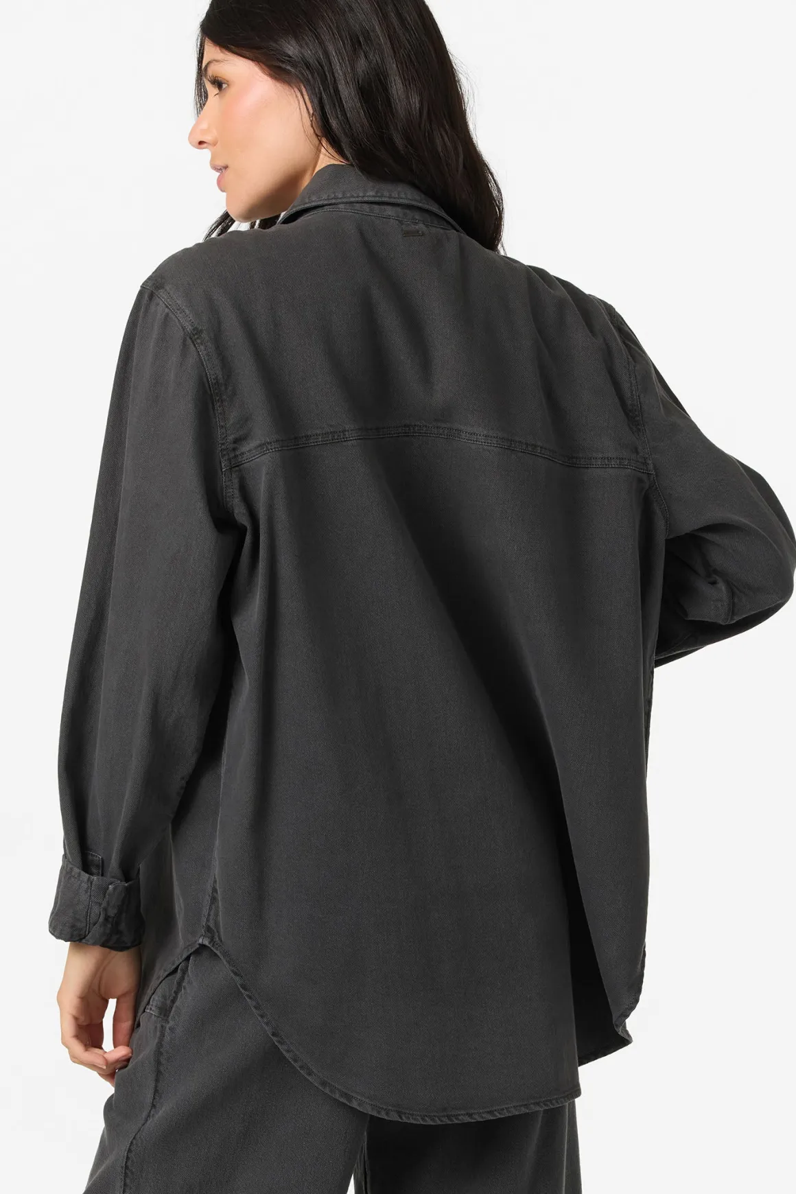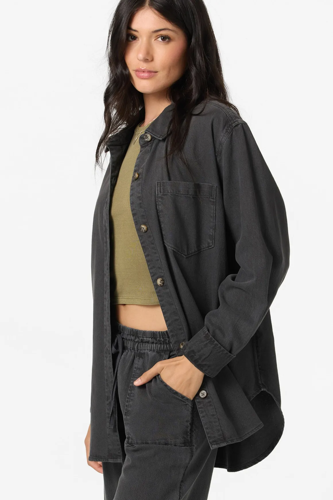 Perfect for layering over your favorite tee or tank, this heavier long sleeve top features a front button design with collar, solid color wash and comfy oversized fit.