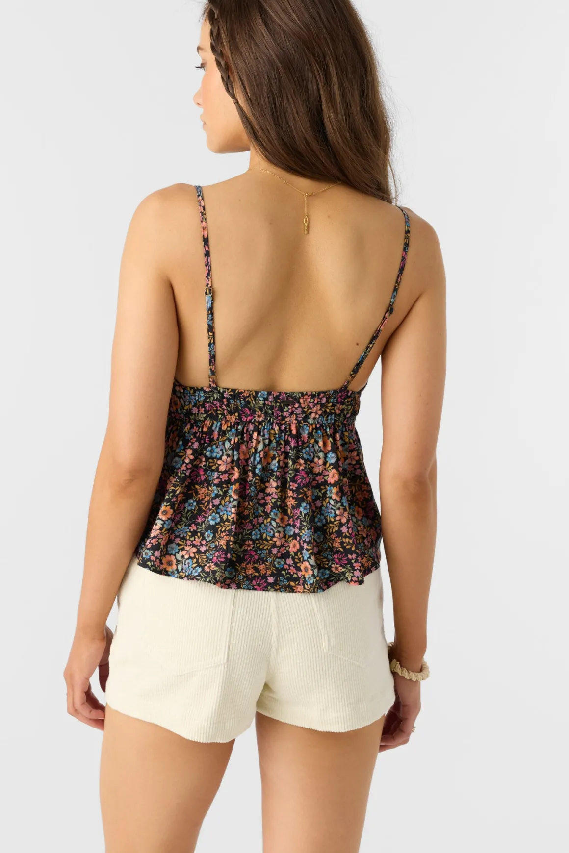 Easy breezy woven tank top that has a colorful print design, empire seam detail and regular length fit.