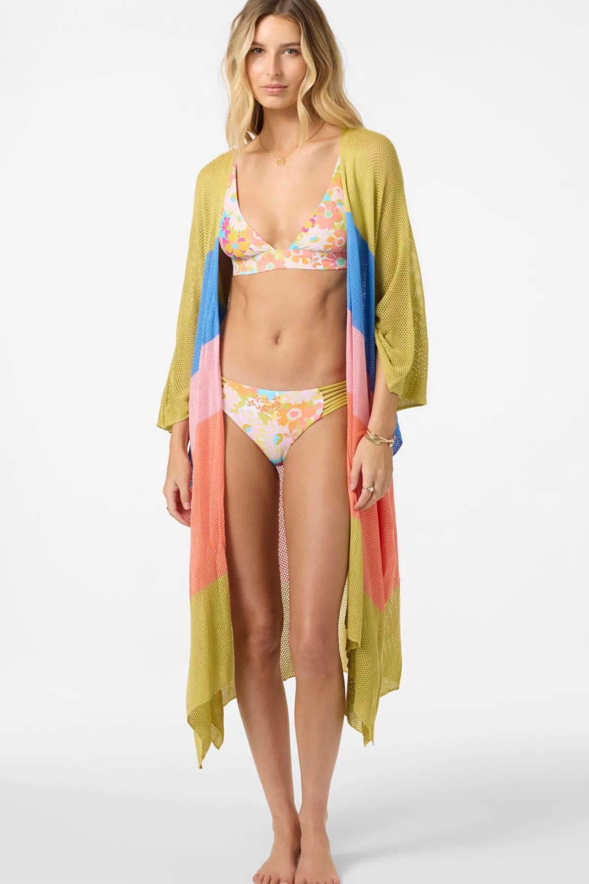 Cute and flowy kimono style woven top that features a crochet fabric design, open front and relaxed fit.