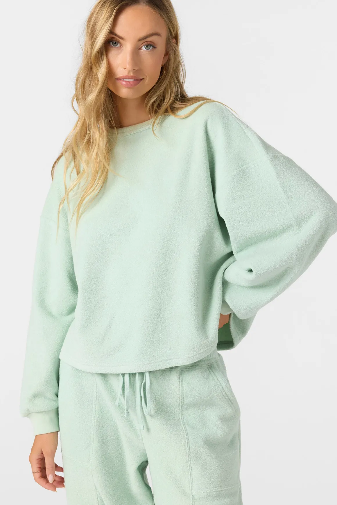 Cozy up in this essential knit pullover. It features a soft cotton-terry fabric feel, crew neckline and oversized fit.